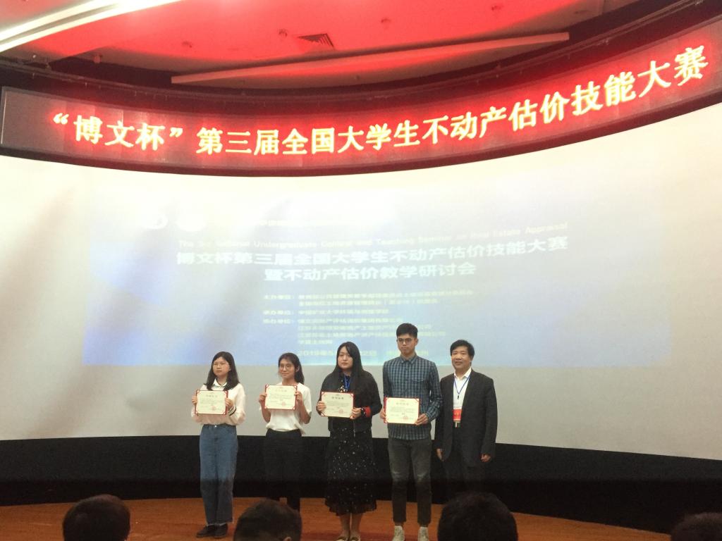 本届全国大学生不动产估价技能大赛现场参赛队伍共有37支,其参赛作品均为经专家外审后在全国范围内遴选的优秀作品,由我院龚健教授指导,土地资源管理专业本科生韩正康、欧嘉婵、管晨悦、刘沛辰团队的参赛作品位列其中。经过激烈角逐,首次参加此类大赛的我院代表队提交的作品“鄂州市梧桐湖新区东沟镇鲊州村(2015)010号集体经营性建设用地(工业用地)、(2018)016号集体经营性建设用地(居住用地)土地使用权价值评估”荣获三等奖,为提升我院大学生不动产估价实践技能积累了宝贵经验。