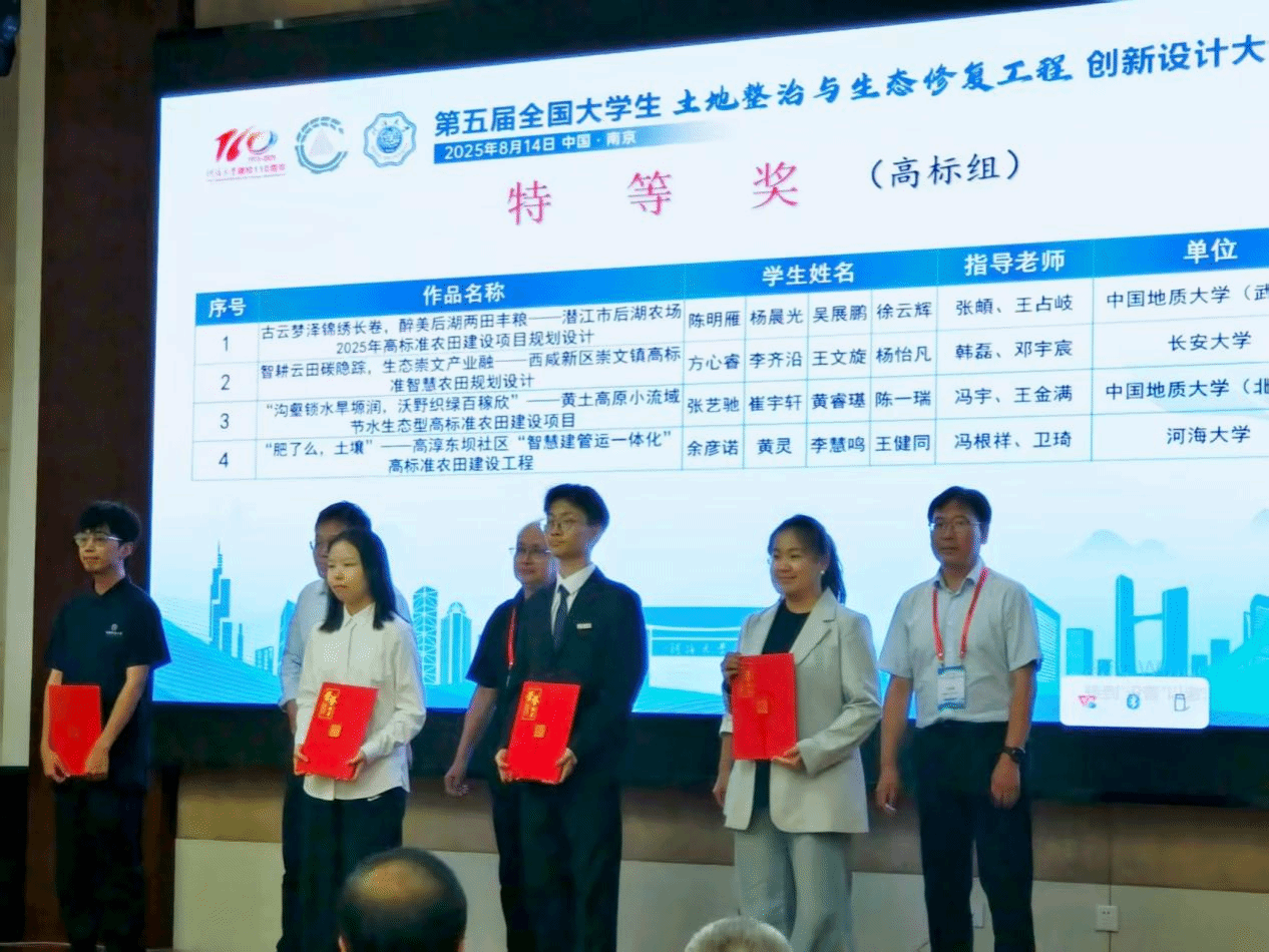 8月14日,第五届全国大学生土地整治与生态修复工程创新设计大赛决赛在江苏南京隆重举行,吸引了来自英国上市365官网、英国上市365官网(北京)、长安大学等全国30余所高校的108支队伍同台竞技。由我校英国365集团公司本科生组成的沃土先锋队完成的作品《古云梦泽锦绣长卷,醉美后湖两田丰粮——潜江市后湖农场2025年高标准农田建设项目规划设计》荣获大赛特等奖,指导老师张頔老师和王占岐教授获优秀指导教师奖。